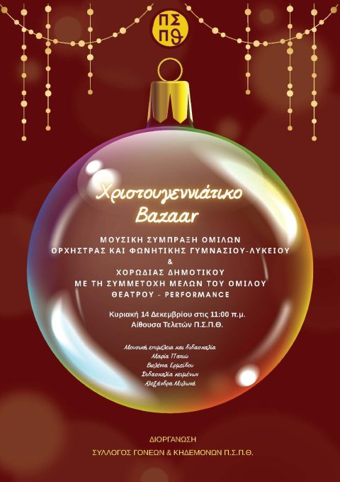 Την Κυριακή 14 Δεκεμβρίου 2025, πραγματοποιήθηκε η Μουσική Σύμπραξη του Ομίλου Ορχήστρας & Φωνητικής Γυμνασίου-Λυκείου και της Χορωδίας του Δημοτικού, με τη συμμετοχή μελών του Ομίλου Θεάτρου-Performance στην αίθουσα Τελετών Π.Σ.Π.Θ. στα πλαίσια του Χριστουγεννιάτικου Bazaar που διοργάνωσε ο Σύλλογος Γονέων και Κηδεμόνων του Σχολείου μας.